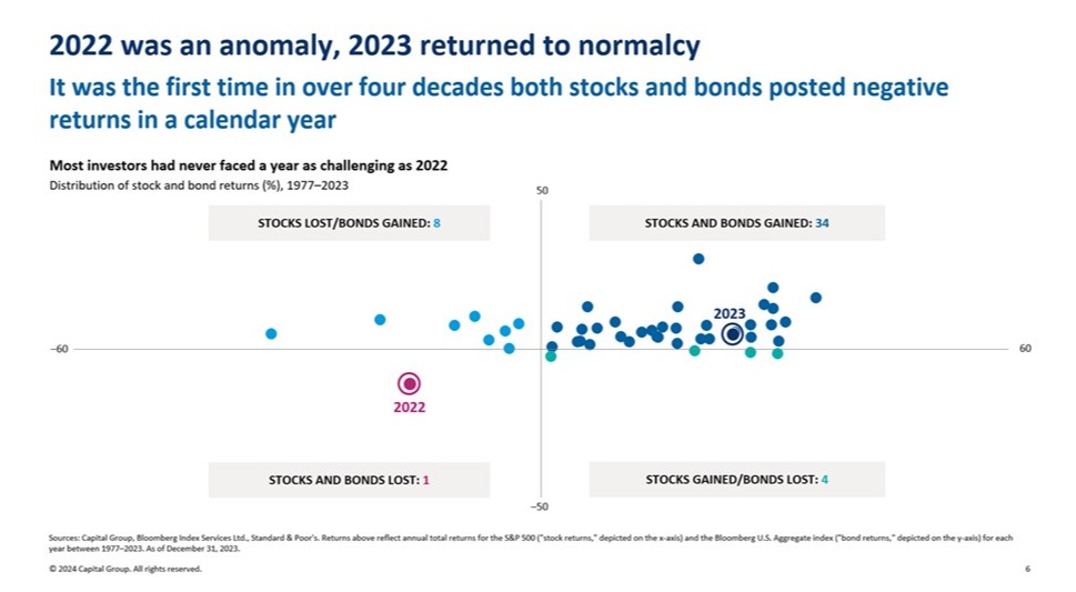 The second thing we would like to remind you is that time-tested investment tools such as diversification and regular rebalancing continue to be prudent strategies for many investors to consider and help us manage your hard-earned investment assets. Many people look back to 2022, when both stock and bond prices fell at the same time, and question whether diversification will work in the future. Our second chart below shows what an anomaly that year was. It was the only time since 1977 that stocks and bonds fell at the same time.