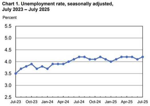 Since early June, the markets had traded in a very orderly and tight range, not experiencing a rise or drop of more than 1% on any day over that time frame. All of that changed with the release of the July unemployment report on Friday, August 1st. Not only was the July number of 73,000 jobs created (vs. 104,000 expected) weak, but the May and June numbers were revised downwards by a stunning 258,000 jobs. However, the unemployment rate rose only slightly to 4.2%, similar to where it has been for the last year, as shown in the chart below.
