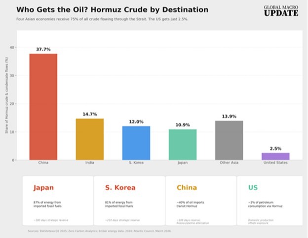 That matters when considering geopolitical risks, such as the current conflict involving Iran and the disruption of traffic through the Strait of Hormuz. Roughly 20% of the world’s oil flows through that narrow passage, which sounds alarming, and it is, globally. But nearly 90% of that oil is headed to Asian markets, not the United States, as shown in our next chart below.