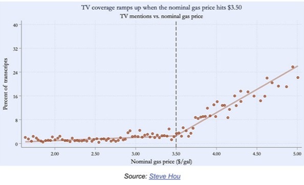 The media also makes sure that you are aware. As you will see in our final chart below, once gasoline prices hit $3.50 a gallon, media coverage of gas prices begins to spike. And both consumers and markets tend to react to what’s most visible, not necessarily what’s most impactful.
