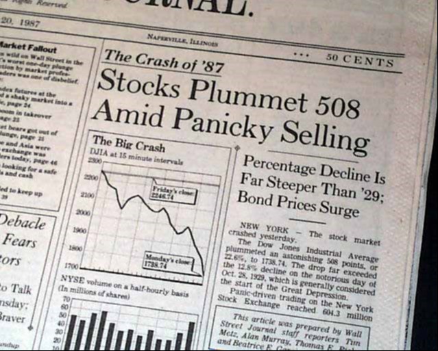 All of this euphoria and optimism came crashing down on Monday, October 19th, when stock markets around the globe experienced what has now become known as Black Monday. The DJIA fell 508 points or 23%, closing at 1739. This was the largest one-day loss in stock market history, and it wiped out more than $500 billion of market capitalization from US stocks. I still have the Wall Street Journal from the next day, which is pictured below. I kept a copy because I thought it might have historical significance, even though I was barely 22 years old at the time.