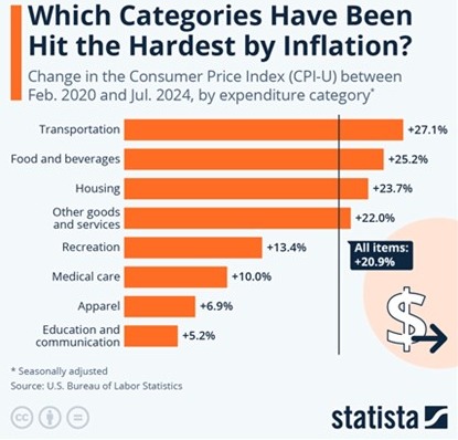 I would like to remind you that a moderating pace of inflation DOES NOT mean that prices have come down or are lower for most things you purchase. As you can see from our second chart below, from just before the pandemic started until the end of July, prices across the spectrum have risen by more than 20%, with a number of very important items rising significantly more than this. While prices are not rising as much as they had previously, polls show that many Americans are frustrated by the higher prices they are paying today. This is especially true when compared to average wage growth over the same time frame.