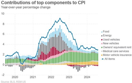 Our color-coded chart shows that during these early days of inflation pressure, energy costs and used vehicle prices, as represented by the Scarlet and Gray bars, were two of the main contributors to rising costs. This makes sense, as energy prices moved significantly higher after Russia's invasion of Ukraine. Likewise, used car prices moved up dramatically when new car production was severely limited due to supply chain constraints in the early days of the pandemic. Inflation, as measured by the consumer price index, CPI, peaked at 9.1% in June 2022. As of our most recent inflationary report in mid-August, inflation finally fell back below 3%, coming in at 2.9%. This has led to an expectation that the Federal Reserve Bank will finally be able to start cutting interest rates at their September meeting.