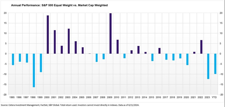 Through late June, the S&P 500 equal weight index is trailing the S&P 500 market cap index by 9.9% this year (total return), after lagging by 12.4% last year. The last time the S&P 500 market cap index outperformed by this magnitude in back-to-back years was 1998-99 during the dot.com bubble. As we begin the second-quarter earnings season, there is optimism that more companies will report stronger growth and that the market will begin to broaden out. This is something the committee will continue to watch closely.