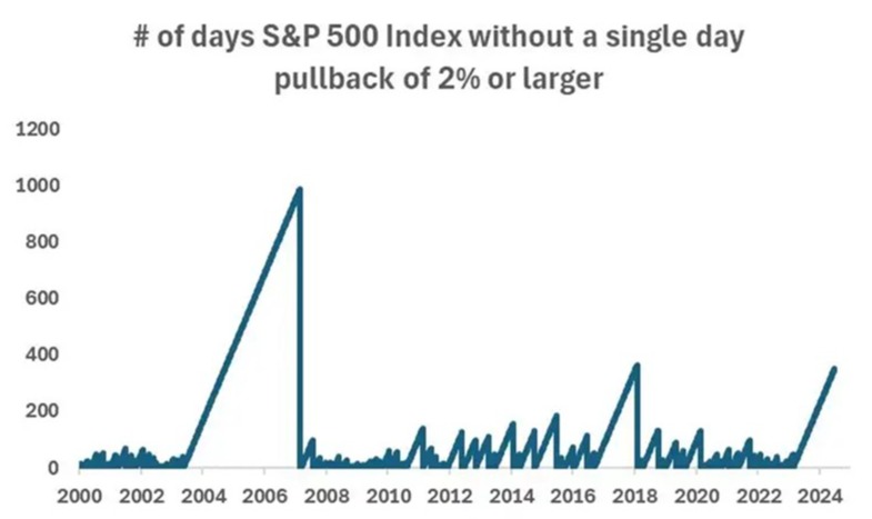 The recent run-up in stock prices has had a couple of interesting features. The first thing you will notice is that there has been very little historical volatility during this market advance. As you can see from our first chart below, since the turn of the century, there have only been two other timeframes when the market went through a similar period of growth without experiencing a single-day pullback of 2% or more.