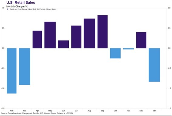 - Economic reports were mixed over the month, with job creation and personal income exceeding expectations, inflation continuing its slow descent in line with expectations, and retail sales falling for the third time in four months.