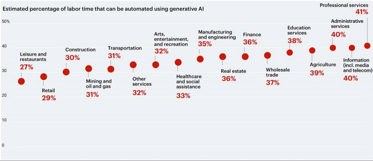Tech and AI companies have largely exceeded earnings expectations and provided strong forward guidance for the future growth of their companies. However, we expect that companies in other industries who rapidly adopt artificial intelligence to be the drivers of future productivity and efficiency in the overall economy. As you can see, in our first chart below, which is provided by Bain and Company, there is an expectation that a wide range of industries can and will benefit from reduced labor costs and time saved as they implement generative AI.