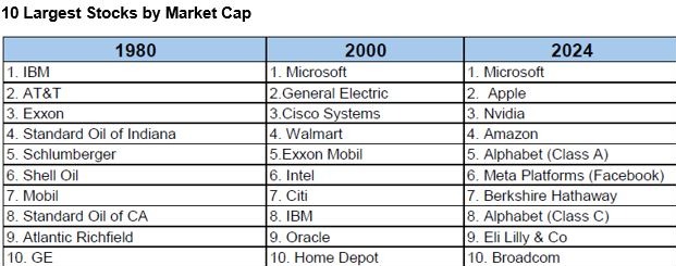 By calendar year 2000, only 2 companies from 20 years earlier were still on the list, and only 1 of these was related to the oil industry. Flash forward to today, and only one company from 2000 remains on the list. Today’s top 10 list is driven by tech and AI driven companies, one of which nobody had heard of just a few years ago.