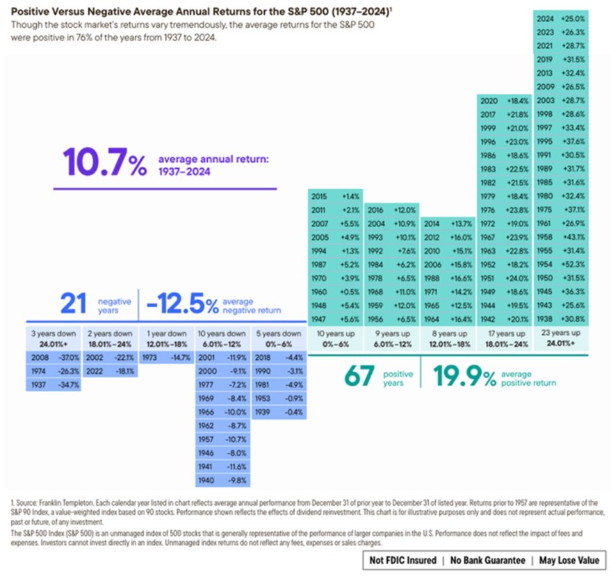 Our final chart should help bolster your faith and confidence in the markets over long periods of time. It shows not only the average return of the markets over long periods of time but also the breakdown of positive years to negative years. We can see that since 1937, the market, as measured by the S&P 500 Index, has produced positive returns in 67 of the 88 years, or 76% of the time.