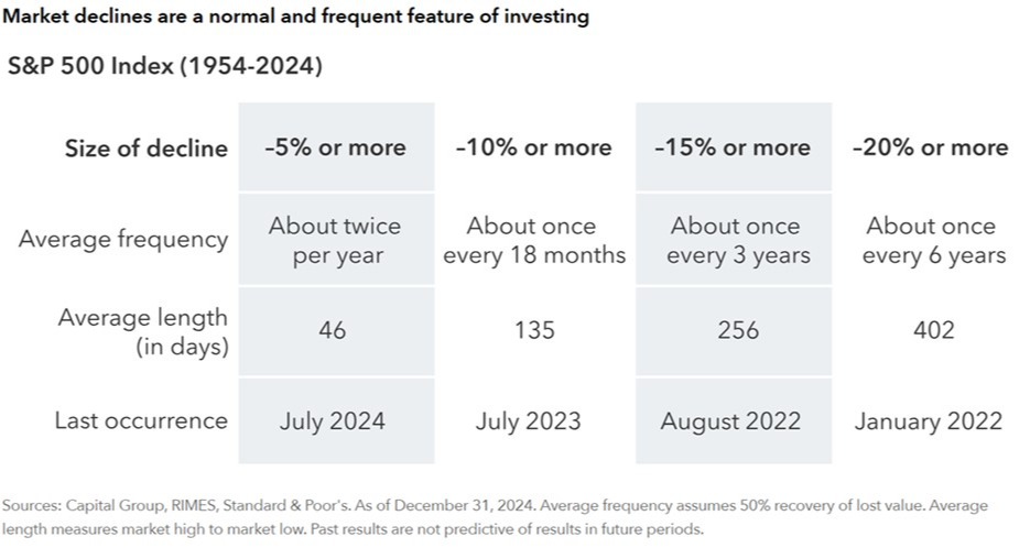 While declines are often jarring, it’s worth remembering that market volatility has been relatively tame. Against a backdrop of record-setting highs, the S&P 500’s largest intrayear decline in 2024 was about 8%, and the market rebounded shortly thereafter.