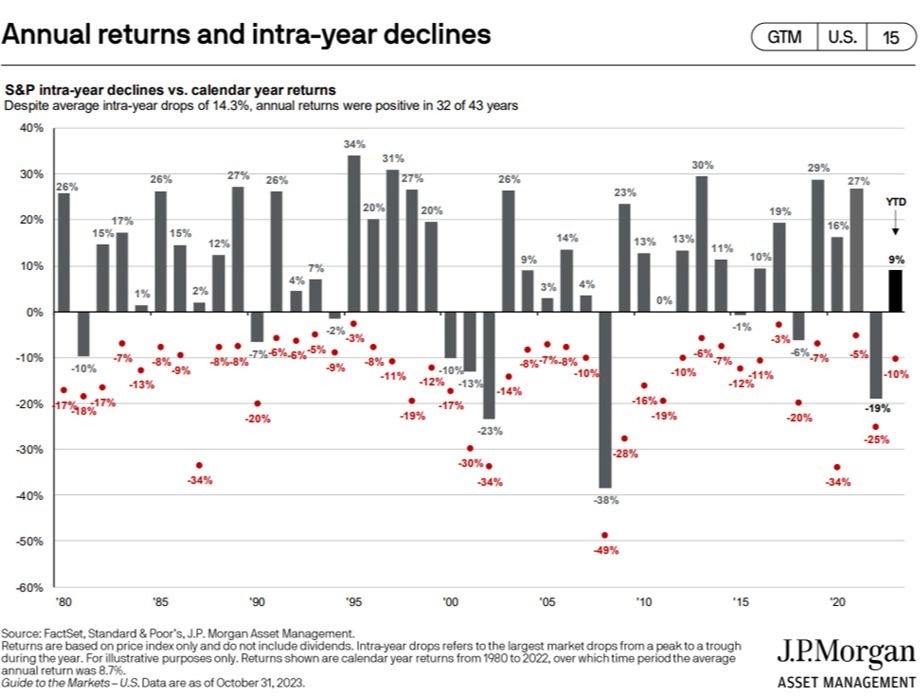 After hitting a 2023 peak of just over 4600 at the end of July, the S&P 500 fell 11% in late October to just above 4100. This level was last seen in late May, as the government debt ceiling issues were still being negotiated. As you can see in the chart below from our friends at JP Morgan Asset Management, intra-year volatility is nothing new. As a matter of fact, the stock market has averaged an annual intra-year drop of 14.3% since 1980.